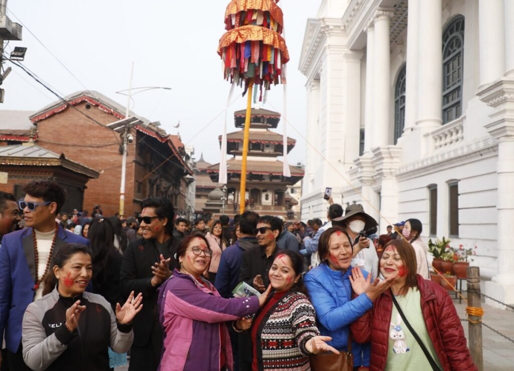 उत्सव मनाउनेहरूले चीर स्थापना गरेपछि विभिन्न रङका अबिर लगाएर रमाइलो गरे।